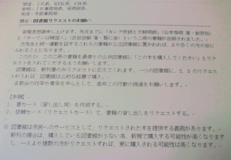 【内部文書2011年9月】図書館リクエストのお願い(抜粋)本来図書館へのリクエストは、リクエストする本人が読みたいと思ってするものだ。 統一協会本部が組織的に布教活動の一環として全国の信者にカルト関連本の偽装リクエストをさせ、公立の図書館に購入させることは公費の搾取に他ならない。