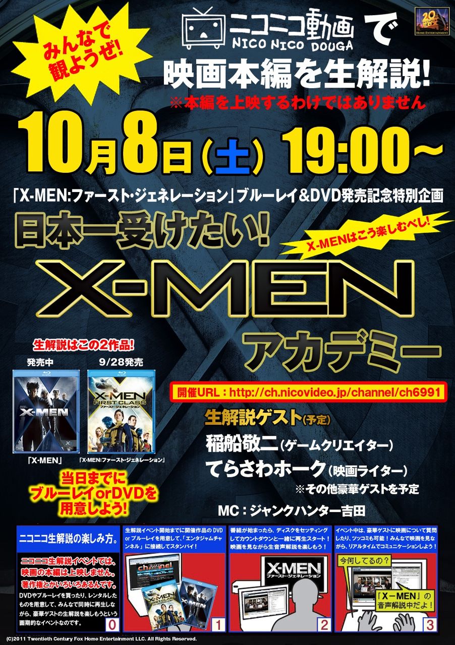超人的なパワーに覚醒した人々=ミュータントの苦悩と冒険を描き、世界的に大ヒットした映画『X-MEN』シリーズ。その最新作『X-MEN:ファースト・ジェネレーション』が早くもBlu-ray & DVDで登場!ソフト発売を記念し、DVD×インターネット連動企画「日本一受けたい!X-MENアカデミー」 の開催が決定!ニコニコ生放送にて、「日本版オーディオコメンタリーは俺たちに任せろ!」と、ひとクセもふたクセもある豪華ゲストが集結します!お楽しみに!