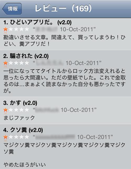 しかし現在のiOS4のAPIではロック画面はさわれないはず。おかしいと思いレビュー画面を見てみると……。どうやらこれはAndroid風のロック画面を壁紙にして「セキュリティを高めていると思わせる」ためのアプリだったのだ。