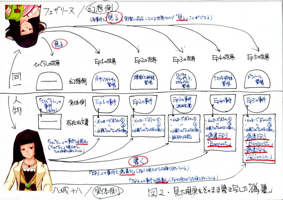 ……という内容を示すのが、図でフェザリーヌからひぐらしに向けて引いた「見る」の矢印。それと八城十八からEp1〜3に引いた「書く」(ひぐらし小説化)の矢印です。