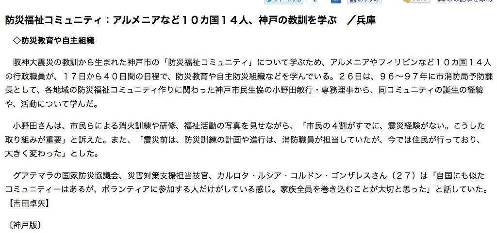 『阪神大震災の教訓から生まれた神戸市の「防災福祉コミュニティ」について学ぶため、アルメニアやフィリピンなど10カ国14人の行政職員が、17日から40日間の日程で、防災教育や自主防災組織などを学んでいる。』