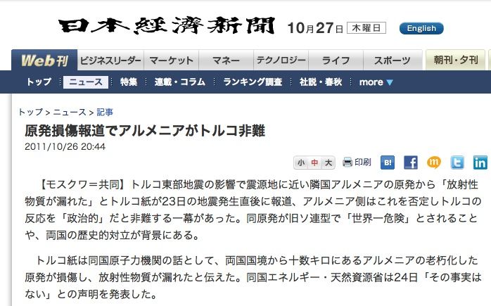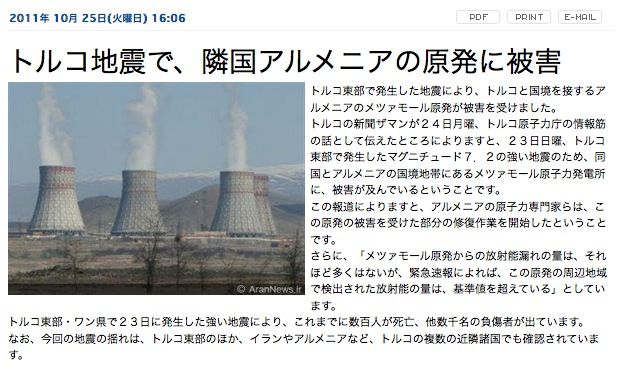 『原発損傷報道でアルメニアがトルコ非難 2011/10/26 20:44