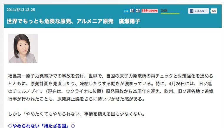 そんなアルメニアでも、「日本よりうちのほうが安全性が高い」と主張しているわけです。どっちが安全かを論じるのはさておき、今日本は原発の安全性でも相当世界各国からなめられてる国だと理解しておくといいのだと思います。そう見ると、今日本が原発を輸出しようと頑張っているのは、相手国から見れば「安く買い叩けるチャンス」と思われているのかもしれないわけです。