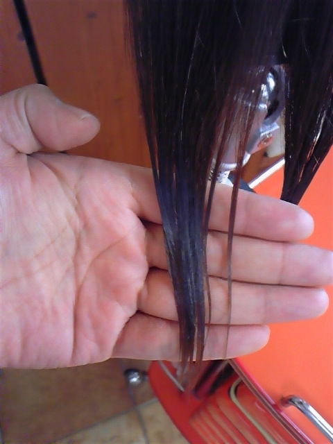 太く多い髪、縮毛矯正とカラーがしてあり、ダメージレベルはきっと4 何となくです