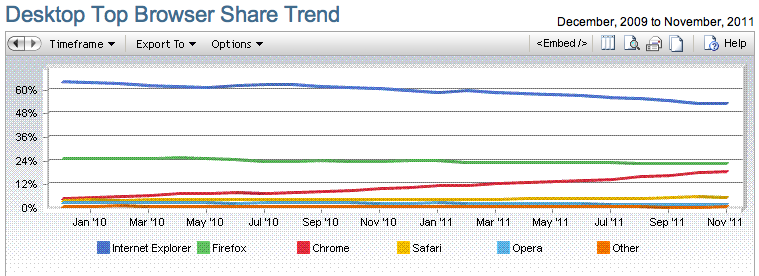 まずブラウザ市場でのFirefoxのシェアが低迷し始めている。調査会社NetMarketShareの調査によると、2009年12月には25.02%あったFirefoxの市場シェアが2011年11月には22.14%にまで低下。一方で、Googleが独自開発したブラウザChromeのシェアは4.71%から18.1%にまで上昇している。来年早々にはChromeがFirefoxを抜きそうな勢いだ。