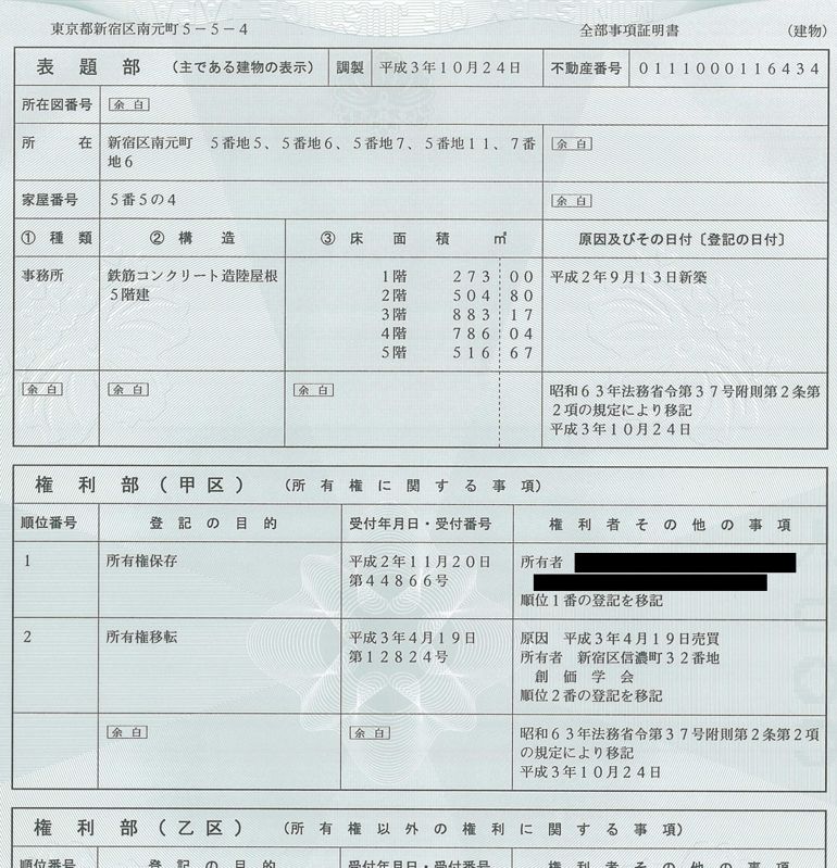 南元センターの登記記録だ。構造欄に「鉄筋コンクリート造陸屋根5階建」とある。
