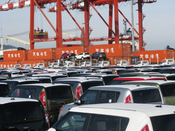 ←昨年12月5日、全南(チョンナム)、木浦(モクポ)新港で輸出用自動車とコンテナが船に積まれている。 木浦/ニューシス