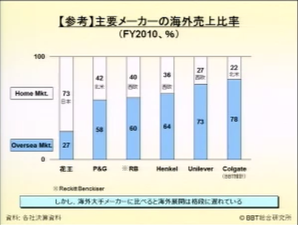 P&G社やユニリーバ-などは海外での売り上げが6割以上を占めており、花王は海外へ進出したときにはこれらの企業と戦うことになる。
