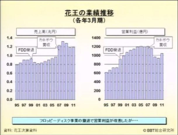 業績を調べてみると、フロッピーディスクから撤退したことにより営業利益が一時は改善したものの、カネボウを買収したころから利益が減少していることがわかる。