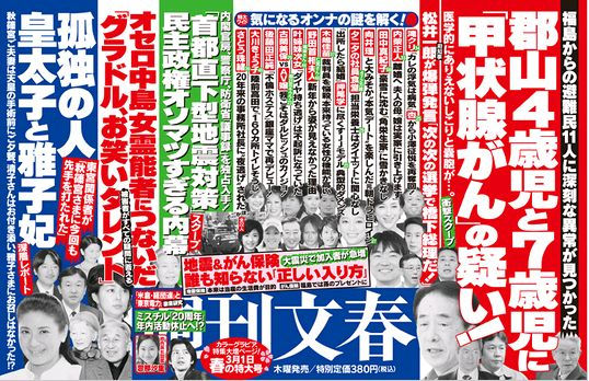 週刊文春の巻頭特集「衝撃スクープ 郡山4歳児と7歳児に『甲状腺がん』の疑い!」は、こうした書き出しで始まっている。