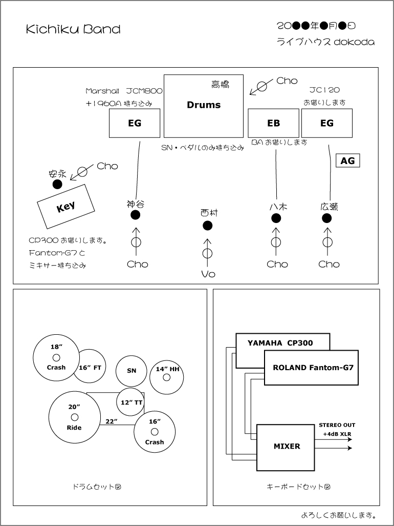 図の黒丸はバンドメンバーの立ち位置を表し、黒丸の後ろの線は