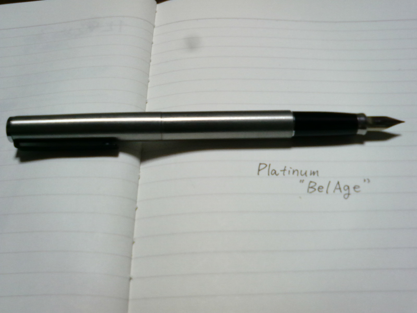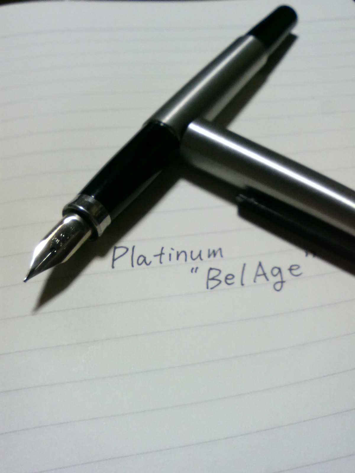 今回ご紹介する万年筆は、プラチナ萬年筆製のBelAge(ベラージュ)です。このペンは僕が初めて所有したペンで、ガマ兄さんから頂いたもの。この貰い物が、僕が万年筆に所得を奪われる原因となりました…まさに、タダより高いものはない。 ステンレス製ヘアライン仕上げの胴軸に、黒のクリップと首軸・尻軸。ペン先は14K-WGと、シャープな印象を受けるこの