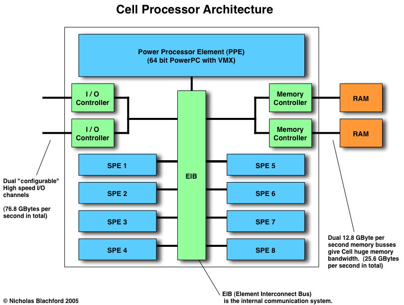 8基のSPE(うち1基は冗長性確保のため非使用(つまり不良コアが1基あっても品質に影響がない。詳しくは後述)。またOS用に常時1基が確保されているため、アプリケーションが使用可能なのは6基)。