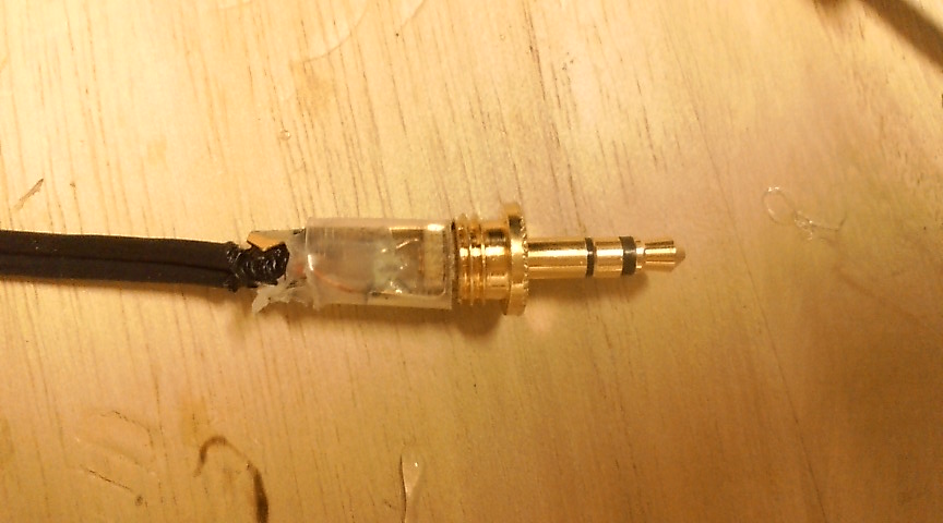 ↑配線をミニプラグに半田付けし、チューブをかぶせ、内側にホットボンドを流し込んで固めればだいたい完成です。