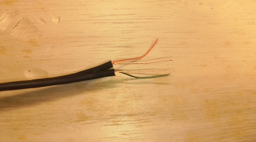 ↑ヘッドホンのコードをぶった切って、配線を引っ張り出しました。二本ある銅色っぽいのがGNDで、緑が右、赤が左に対応している…はず。聞きながら合わせたのでもうどっちか覚えていませんww