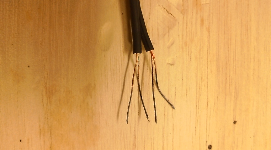 地味にこの配線を引っ張り出す作業が面倒でした。普通、ニッパーの根本で簡単に配線の被覆を剥がせるもんですが、持っているニッパーが小さくてそれやると中の配線も切れてしまうんです……。しょうがないのでナイフでやりました。太さ3mmのコードから1mm程度の配線を傷つけずに取り出すのは思いのほかたいへんでした。配線って、極細の銅線がねじねじ束ねてまかれていて、ナイフで半分くらいごっそり切りまくっていらいらです。手先を器用にしたいものです。というかいろいろな大きさのニッパーがほしいです
