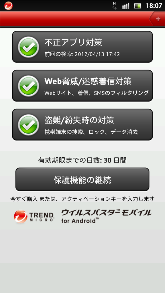 ウイルスバスターモバイル for Androidトップ画面(左)とウイルスチェック結果(右)。チェック結果はステータスバーでわかりやすく表示される