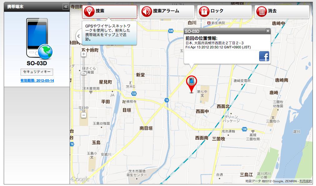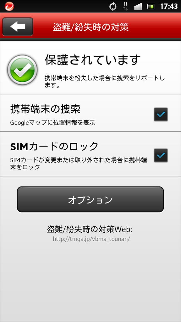 盗難/紛失対策設定画面。スマホを失くした時にPCなどからログインして、リモート操作を行う