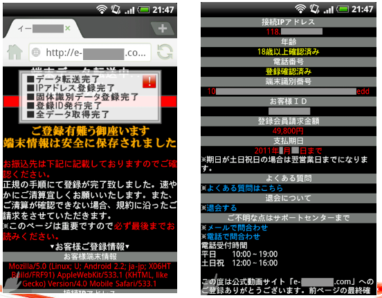 スマホを狙うワンクリック詐欺Webサイト例