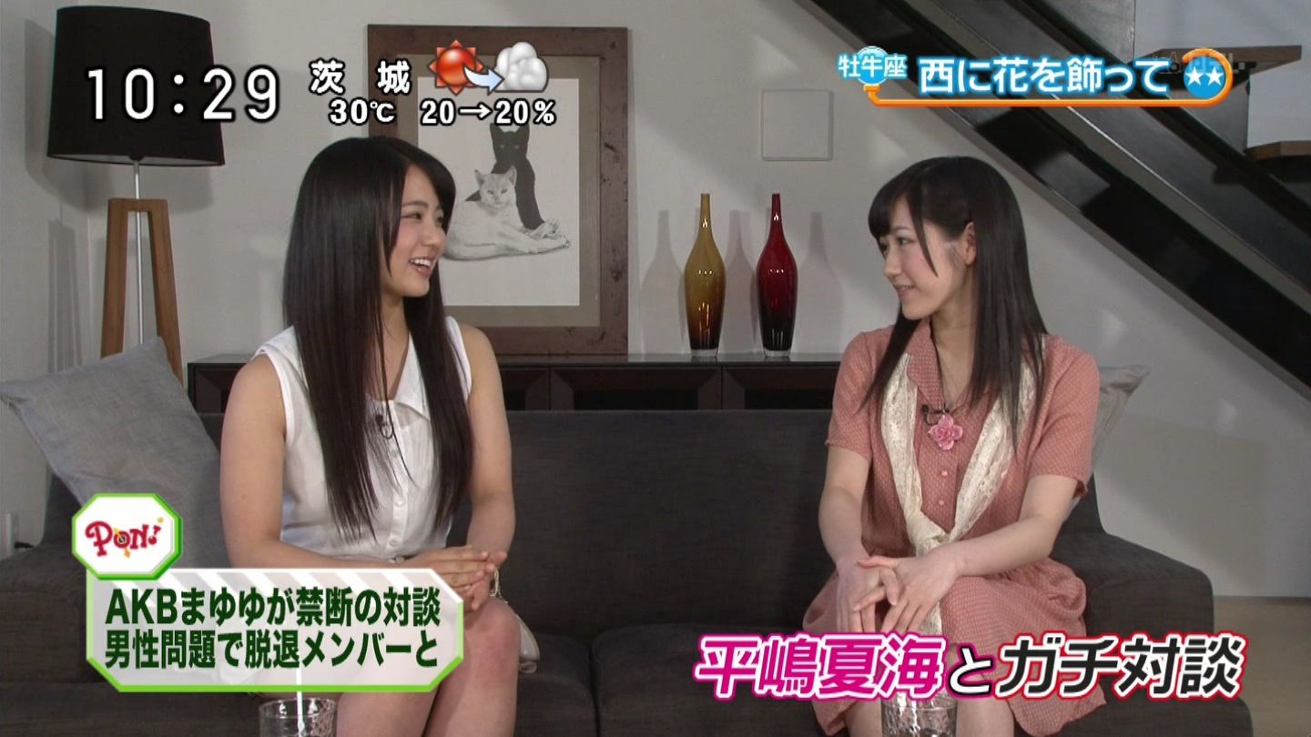 まゆゆが「ショックでした。許してないわけではないけど、100%許しているわけじゃないかな。やっぱり、ああいう事件があって、いろいろ大変な思いがあったので…いろいろ思うところはあります」と複雑な思いをストレートにぶつけると、平嶋は涙をこぼしながら「本当に自分がふがいない。私の口からは、ただただ申し訳ない、としか言えない。(AKBに)戻りたいけど、もう戻れない」と謝罪した。さらに「AKB48」の「恋愛禁止ルール」などについても語り合った。