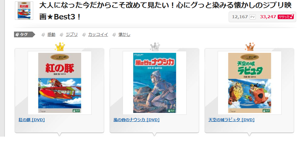 ジブリの映画って年齢とか考え方で大きくランキングが変わってくるとおもいますのでこれは面白い。