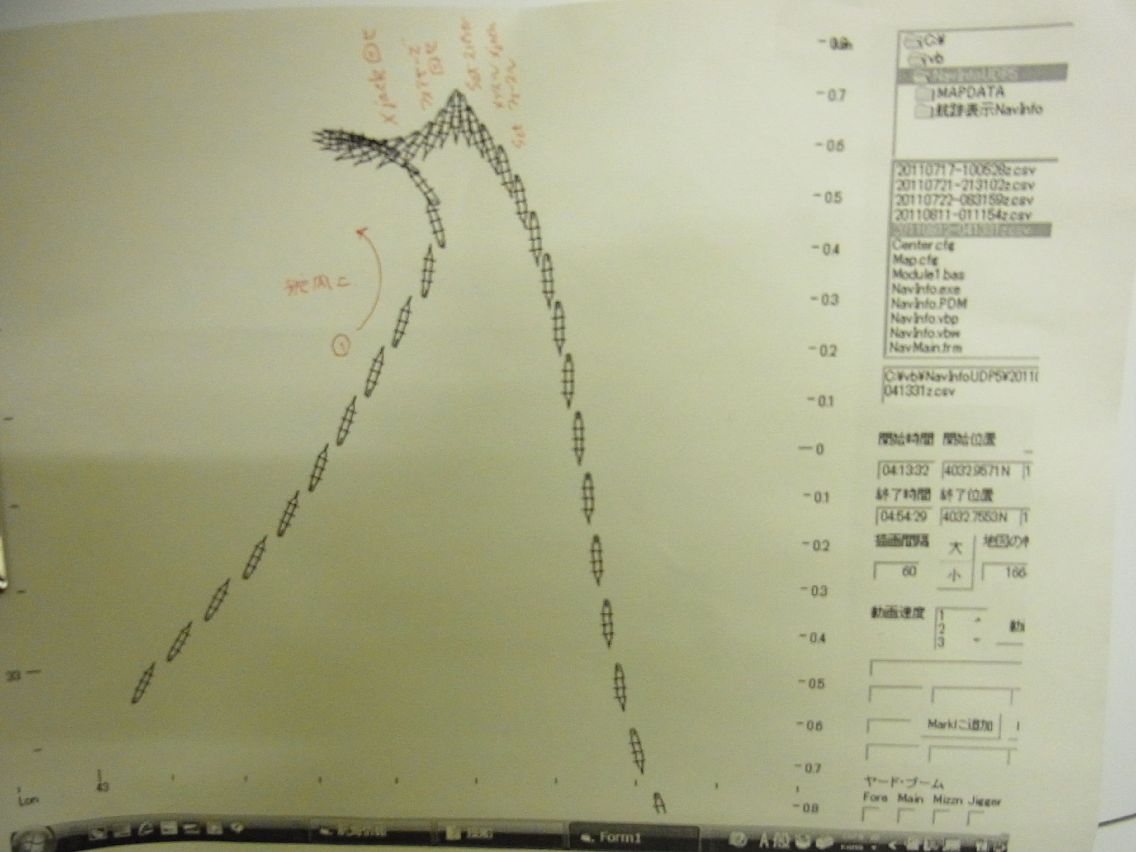 これは帆船のタック(風上にむかって方向転換)の様子です