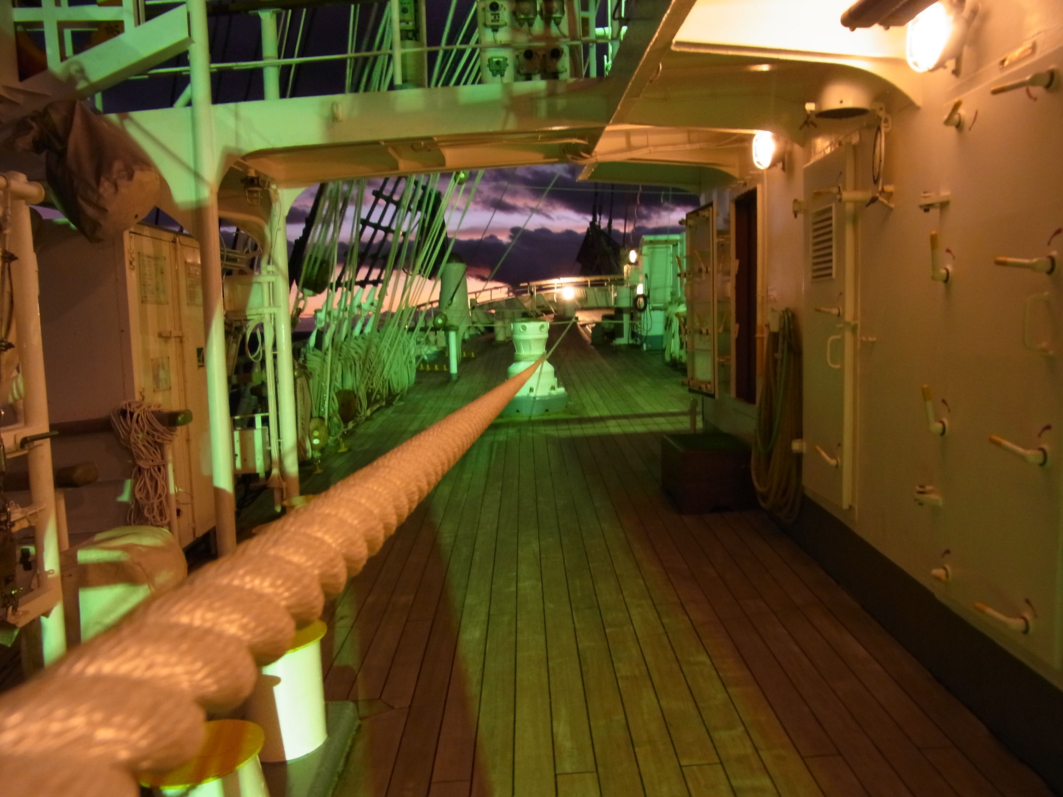 荒天が予想されたため船内の各所にロープを張っています