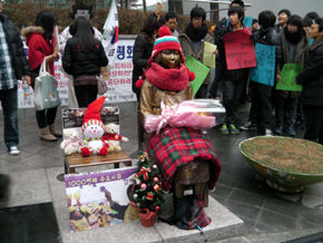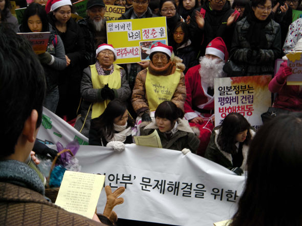 サンタの帽子をかぶり水曜デモに参加したキル・ウォンオク(83)ハルモニは去る18日、韓-日首脳会談で‘慰安婦問題が解決されなければ第2、第3の平和の碑が建てられるほかはない’とした李明博大統領の話に言及して「50年間、ずっと聞きたかった言葉だった」と笑った。また、1000回水曜デモに出てきた多くの人々を見て「胸を痛める人々と共にする人が多くて驚いた」として「子供から老人までより多くの人々が‘慰安婦’問題を知ることが同じ苦痛を繰り返さないことになる」と話した。