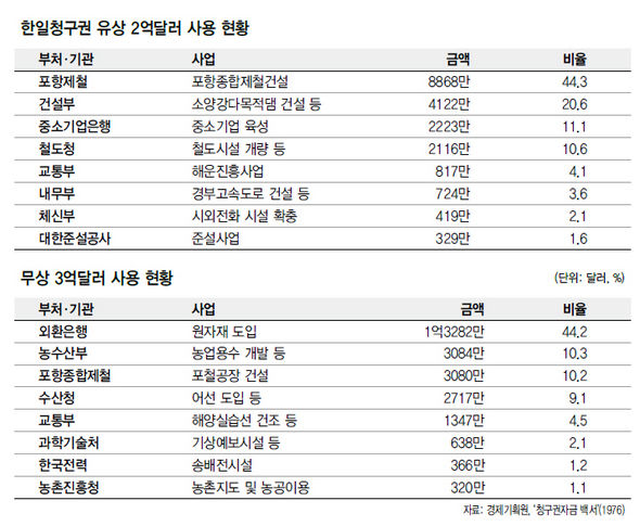 ポスコには66年から支援された対日請求権資金の内、1億1948万ドルが投入された。 経済企画院が出した‘請求権資金白書’(1976年)資料によれば、浦項製鉄所に投入された資金は無償資金3080万ドルと有償資金8868万ドルであった。 韓国政府が日本から受け取った無償・有償資金5億ドルの23.9%に達する金額だ。(<表>参照)