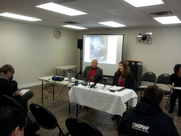 強大国参戦軍人の殺人犯罪糾明・断罪を未だ無視する韓国政府←去る4月26日、カナダ、バンクーバーの韓国人会館でビクトリア大学のジョン プライス教授(左側)をはじめとするカナダ市民社会の人々が韓国戦争期にカナダ軍人によって韓国人が殺害された事件に関して、カナダ政府が遺族に謝罪し補償せよと要求する内容の記者会見を行っている。 キム・ドンチュン提供