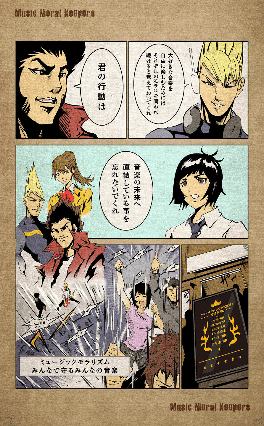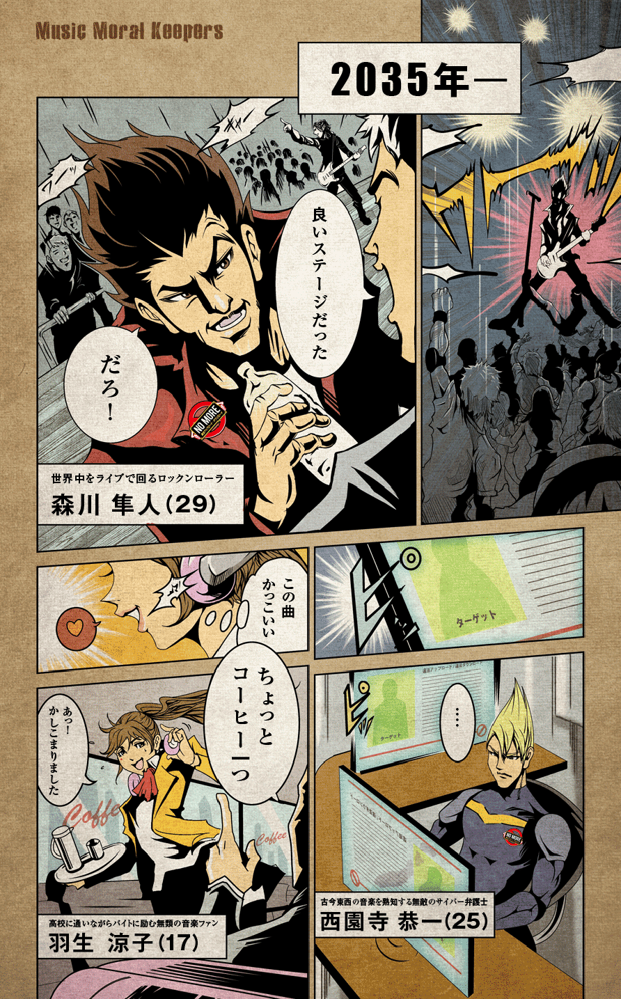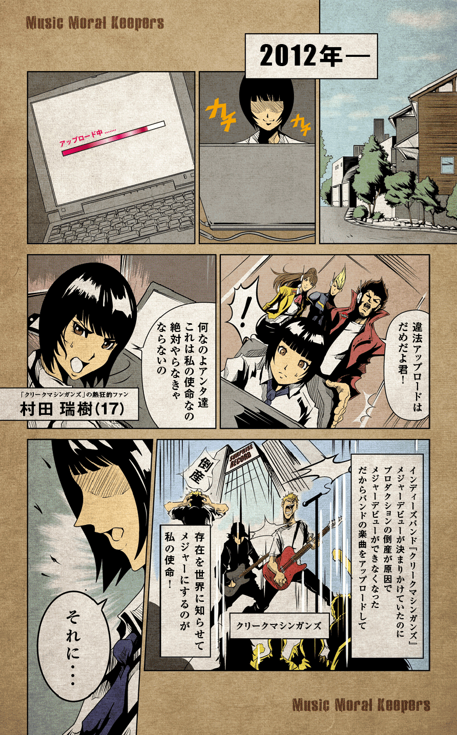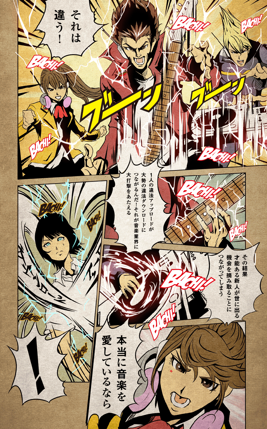 音楽市場規模が10分の1に減少した近未来を描いたオリジナルコミックなどが掲載されている。
