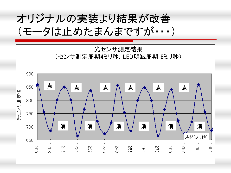 ライントレースしての実験ではないので不完全ですが、8ミリ周期でLED光を点滅しながら、光センサも測定し、輝度計算もできていました。