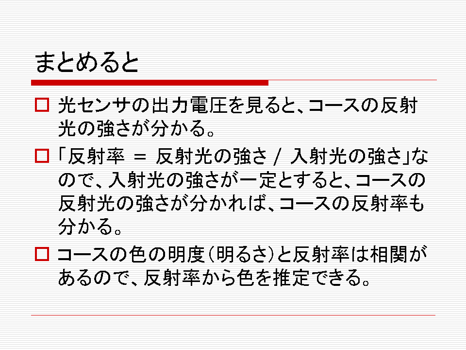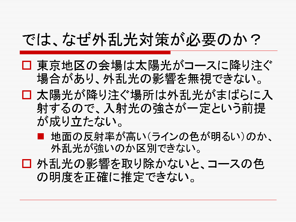 slideshareにアップしたプレゼン資料にも書いていますが、特に東京地区大会の会場のように太陽光がコースに直接入射する場合、光センサーの仕組み上、地面の反射率が高い(明るい色)なのか、太陽光が強いのか区別できなくなります。そして、レーンが識別できなくまります。