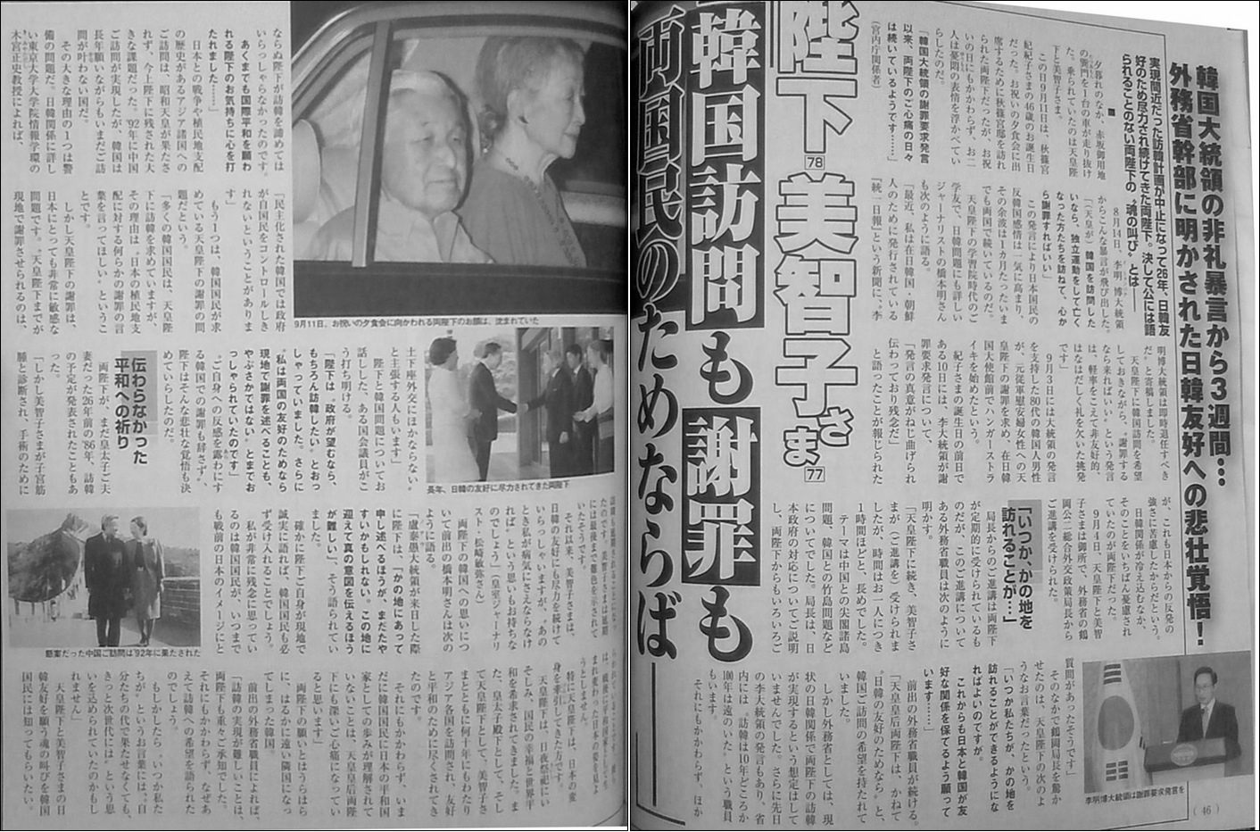女性自身(2012/10/02)陛下・美智子さま「韓国訪問も謝罪も両国民のためならば」