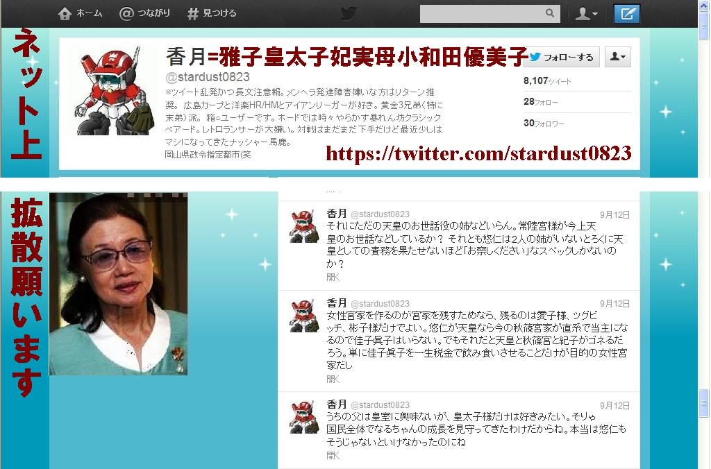 http://twitter.com/stardust0823香月@stardust0823今の天皇皇后は完全に老害。人間のクズだわ。政治的な発言も平気でするし国民感情もまるで理解できない。男孫を産んだ義理の娘を妾並みに溺愛し、優秀な女孫を産んだ皇太子妃は徹底的にイビる。こいつらより皇太子様と雅子様の方が100%絶対に日本をよくしてくださる。老害は去れ!!