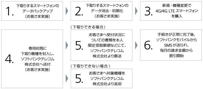 サービス開始当初は下取り端末をソフトバンクショップで預けることが可能だったが、25日以降は、ソフトバンクショップでは申込みのみ行い、端末は専用封筒に入れた後、依頼者自身がソフトバンクテレコムへ送る形となる。その後、受付状況に関しての書類がソフトバンクテレコムから依頼者のもとへ届くことになる。
