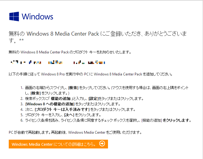 届いたメールには、Windows 8 Media Center Packのプロダクトキーが記載されています。とりあえず大事に保管しておきましょう。