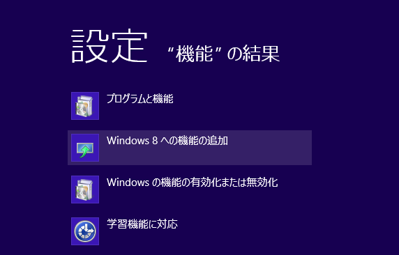 つぎに、「Windows8への機能の追加」を開きます。Windows+Wキーで機能の検索画面を表示し、「機能」と入力しましょう。