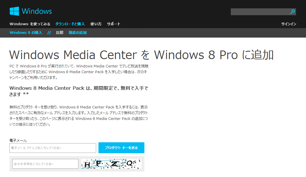 Windows 8 Media Center Packを導入ためには、まずプロダクトキーを入手しなければなりません。メールアドレスを登録すればOKで、無料で発行されます。まずはWindows8の「機能の追加」ページからメールアドレスを登録しましょう。