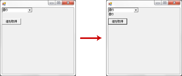 using System; using System.Windows.Forms; class Sample { [STAThread] public static void Main() { Application.Run(new MainForm()); } } class MainForm : Form { private ComboBox comboBox = new ComboBox();//コンボボックス private Label lb = new Label(); //ラベル private Button bt = new Button(); //ボタン public MainForm() { //値の設定 comboBox.Items.Add("晴れ"); comboBox.Items.Add("曇り"); comboBox.Items.Add("雨"); lb.Text = ""; lb.AutoSize = true; lb.Top = comboBox.Bottom; bt.Text = "値を取得"; bt.AutoSize = true; bt.Top = lb.Bottom; this.Controls.Add(comboBox); this.Controls.Add(lb); this.Controls.Add(bt); bt.Click += new EventHandler(bt_Click); } public void bt_Click(Object sender, EventArgs e) { lb.Text = ""; //値を取得 lb.Text += comboBox.SelectedItem.ToString() ; } }