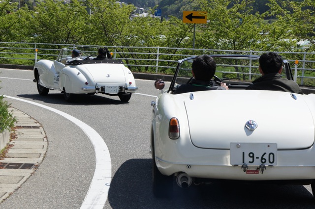 この緑。萌葱色?というのでしょうか。新緑がめちゃくちゃ綺麗。前後には名車達が走って、ホントに非日常です。