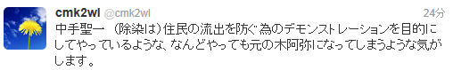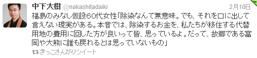 中手聖一 (除染は)住民の流出を防ぐ為のデモンストレーションを目的にしてやっているような、なんどやっても元の木阿弥になってしまうような気がします。