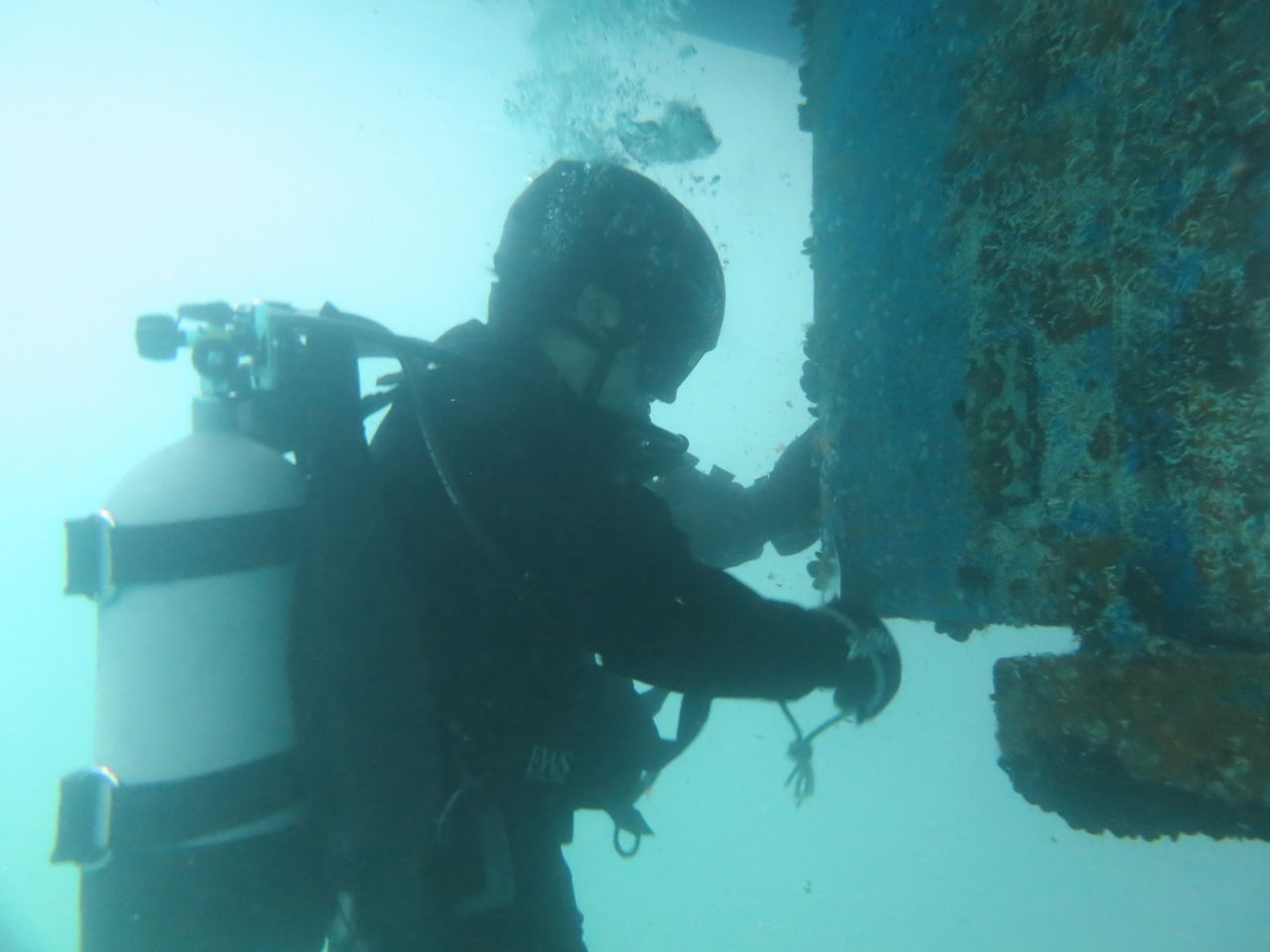 作業を行うにあたり、まず隊員2名で船底の状況把握のため写真を撮影