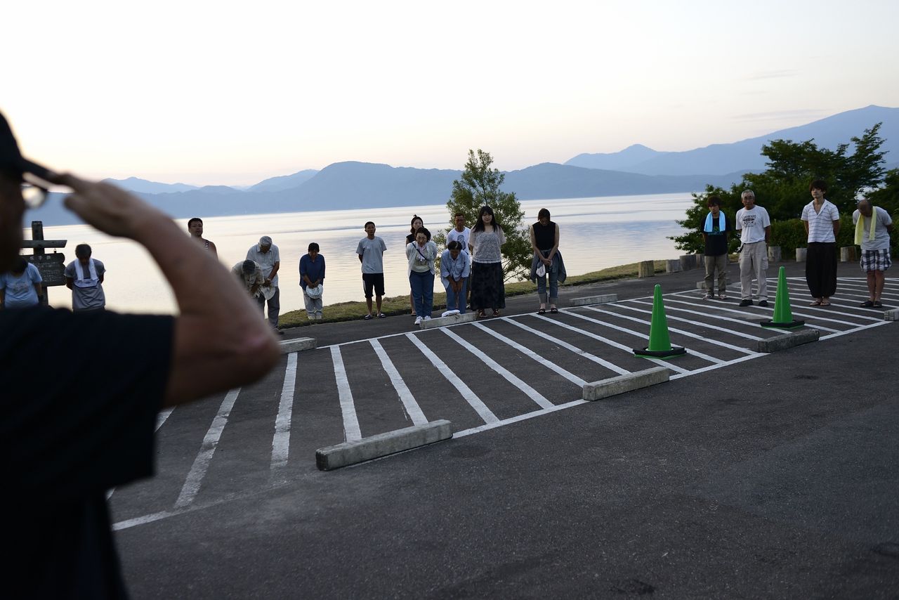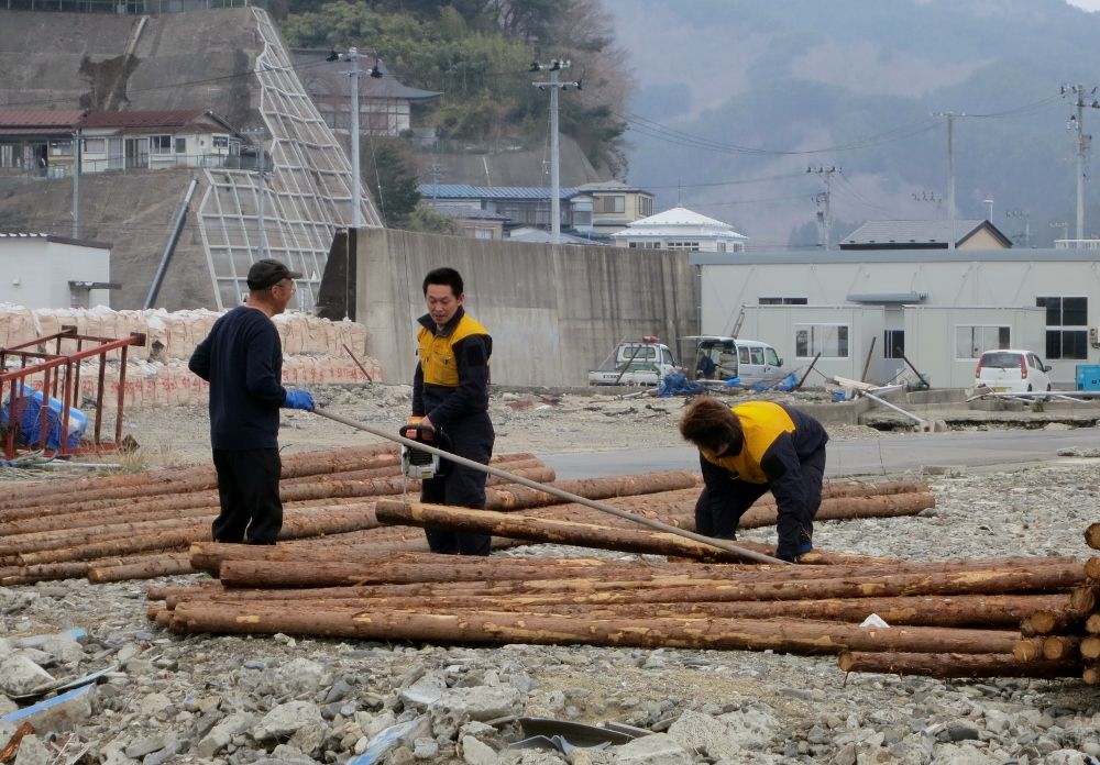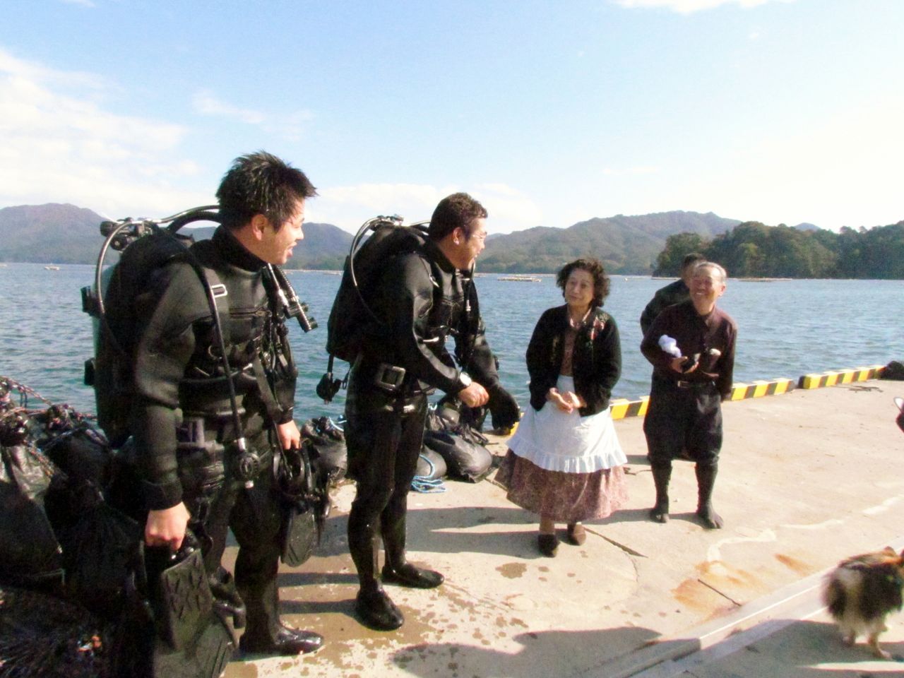 陸上では船長さんたちが船底での作業を心配そうに見つめていました。