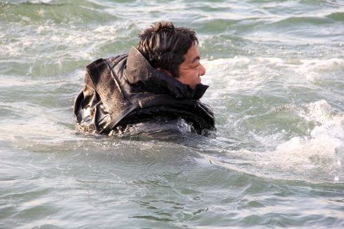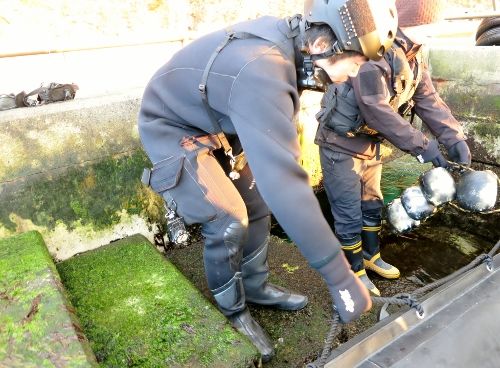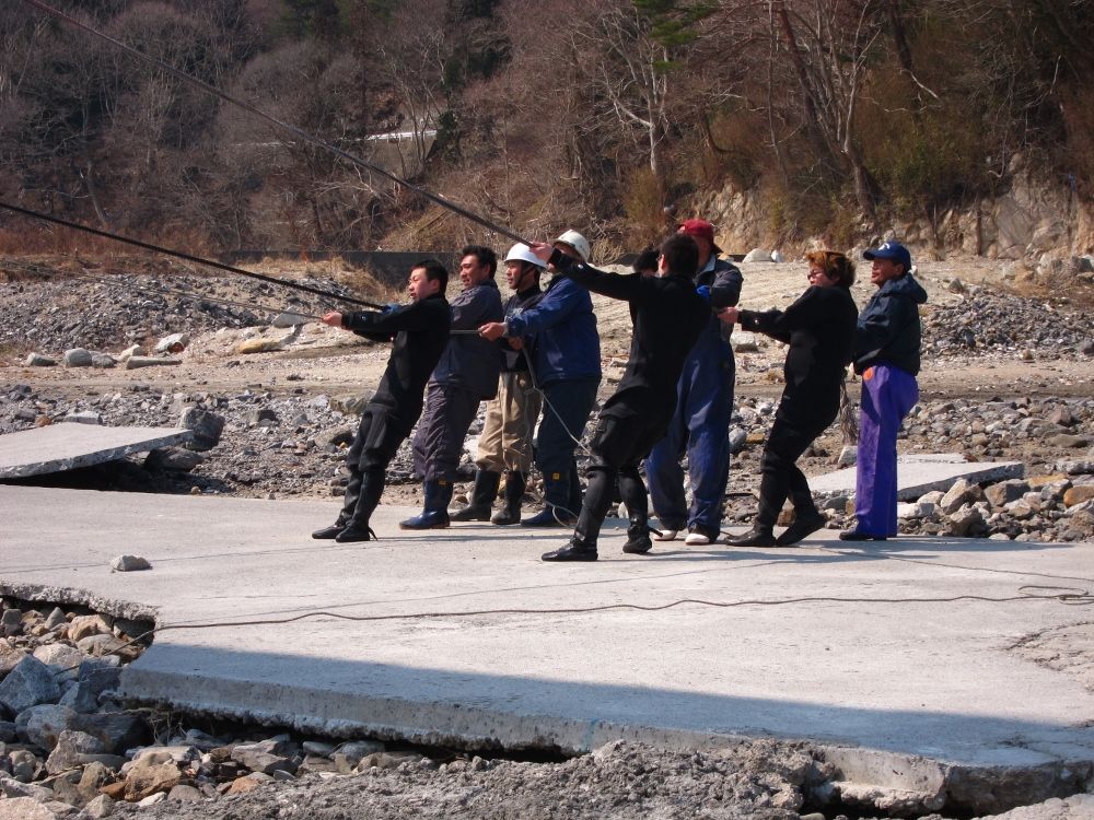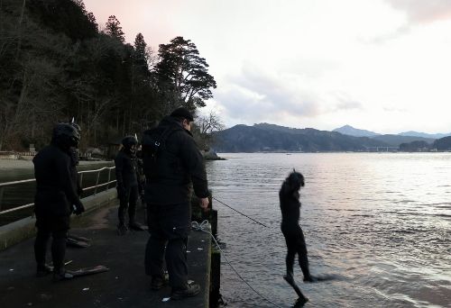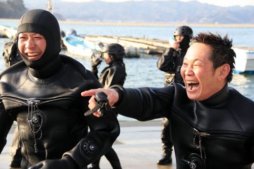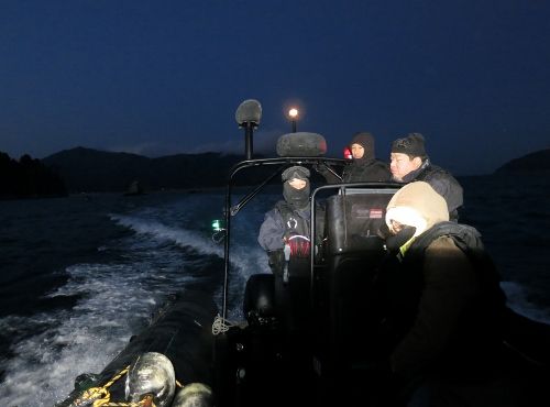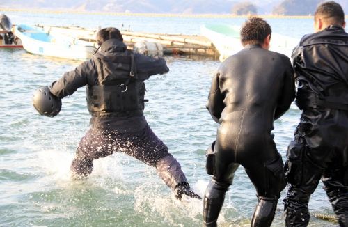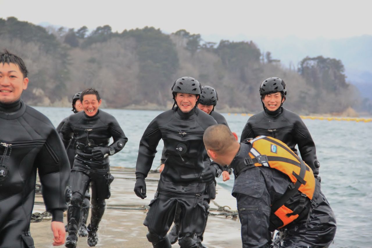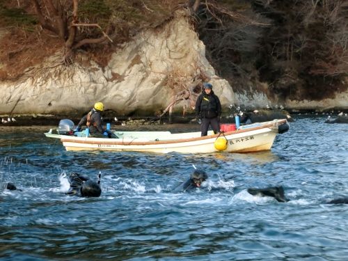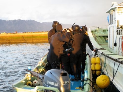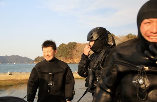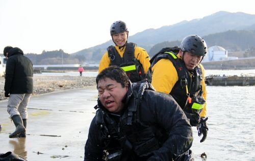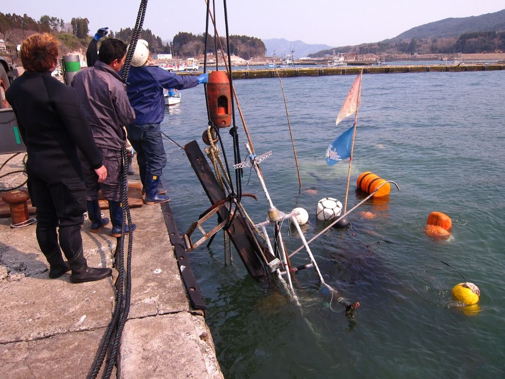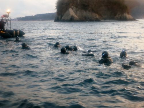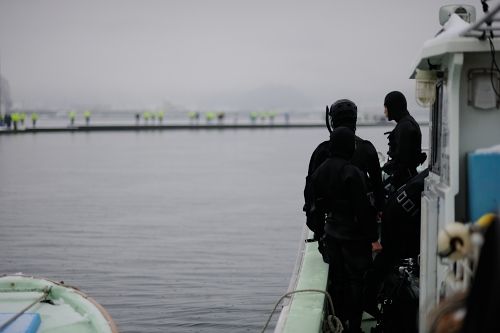 水面まで上がると、特務中隊と漁協の方皆で陸に引き寄せます。