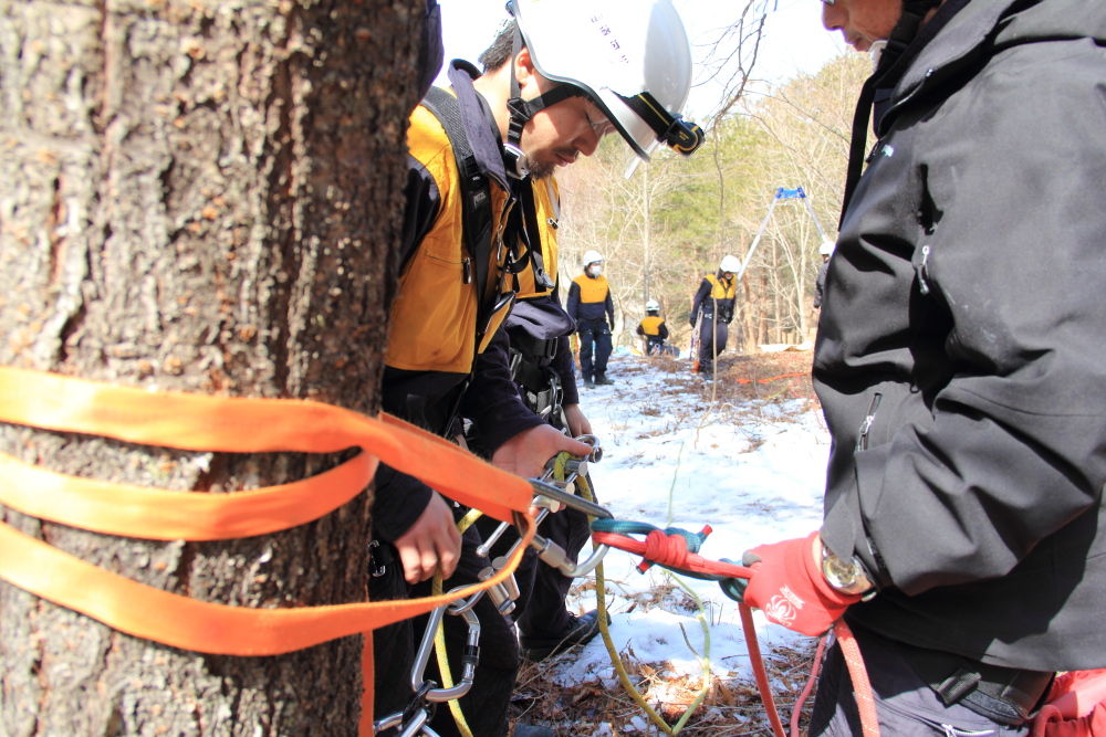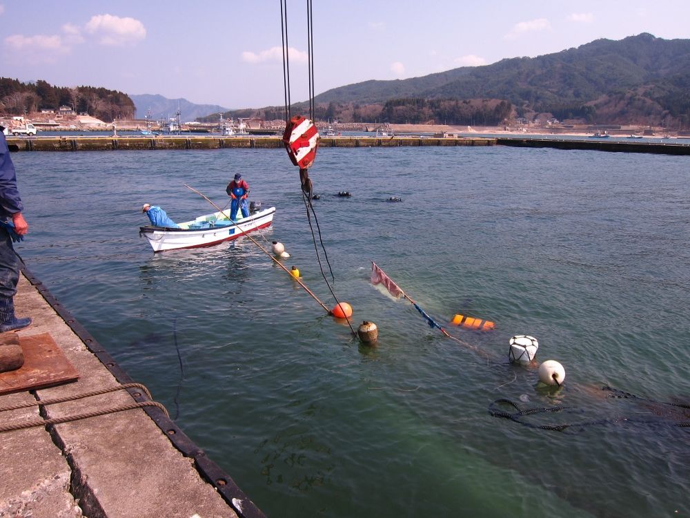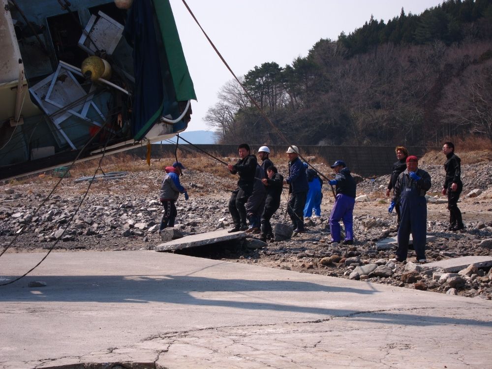 がれきの引き上げと同様の工程で、まずは船にワイヤーを取り付け。船体から多数のロープが出ているため、絡まないように注意しながらの作業。