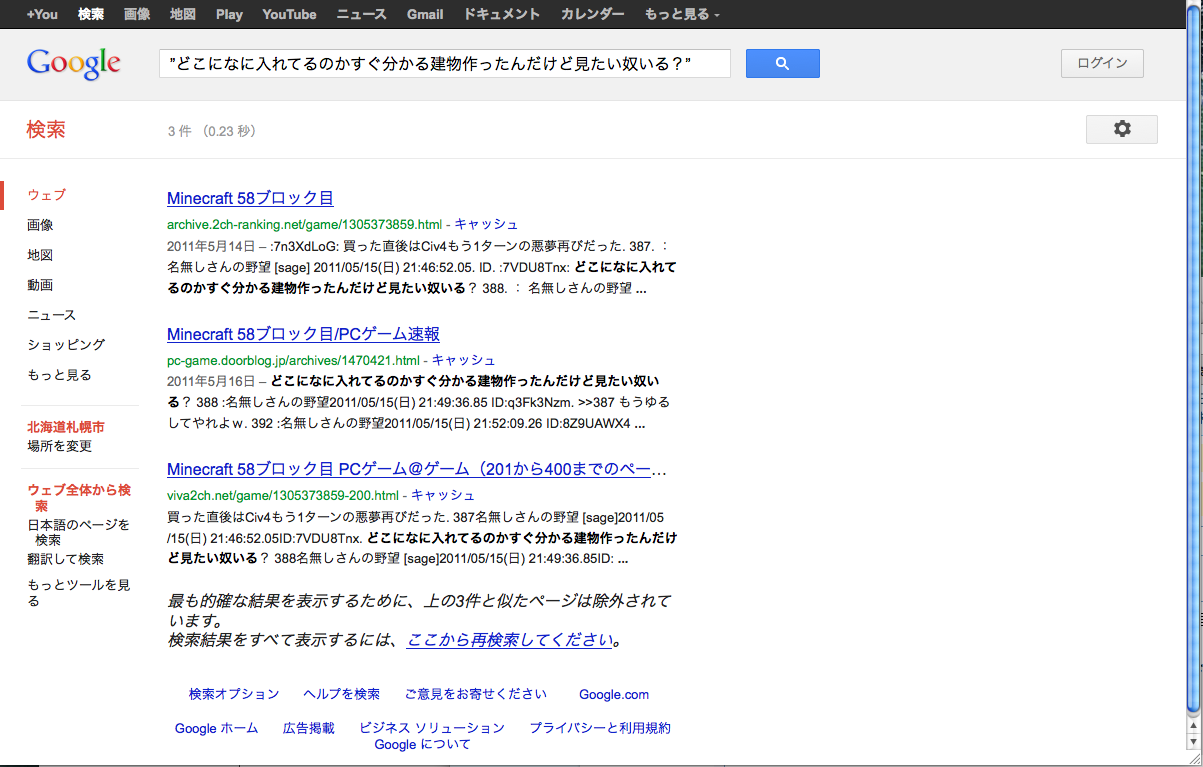 つまり、この台詞で検索すれば元ネタにたどり着ける。「許されざる倉庫」は作成者本人が自称したのではなく、後からそう呼ばれるようになったのだと考えれば、僕は「許されざる倉庫」で検索していたからこそ、元ネタにたどり着けなかったともいえる。
