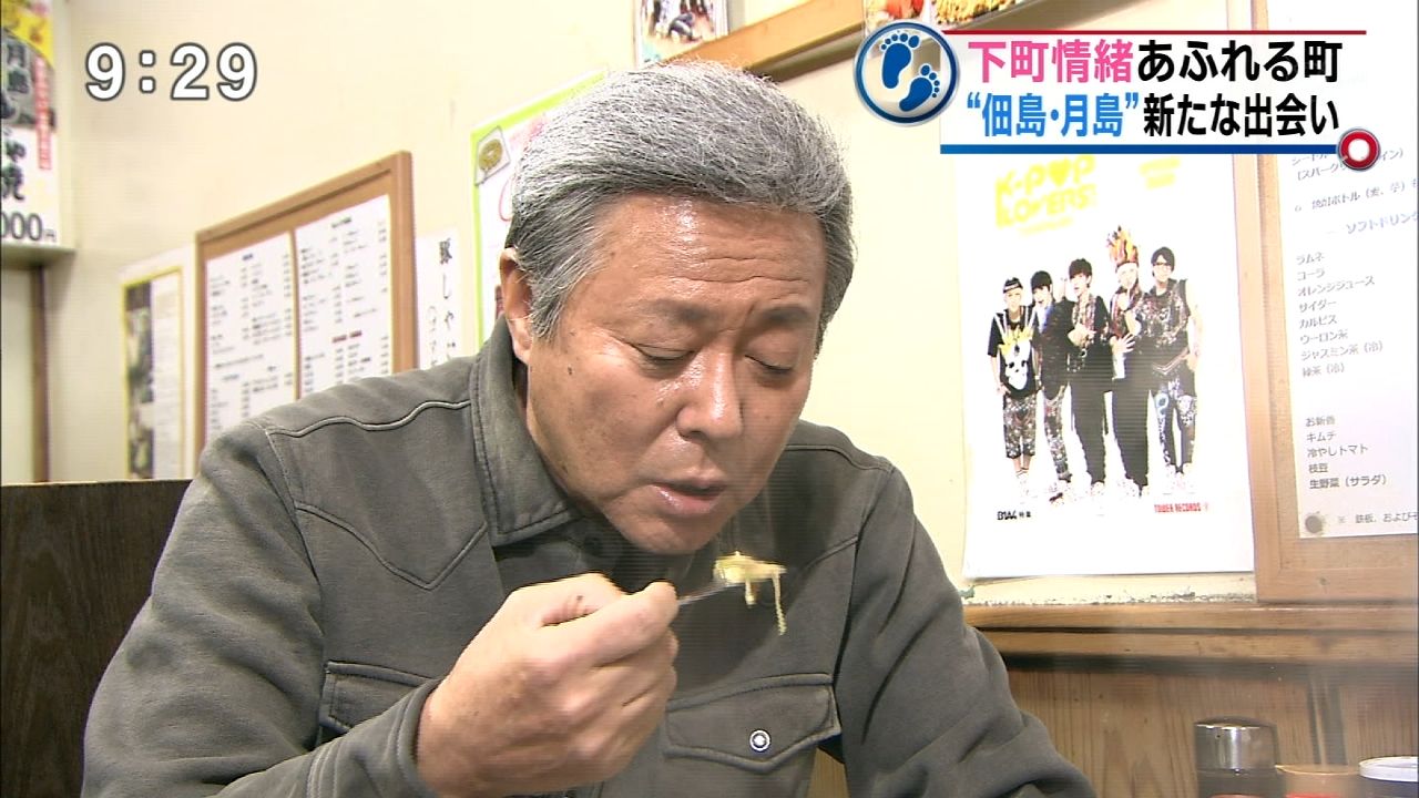 下町のもんじゃ屋で食事をする小倉さん
