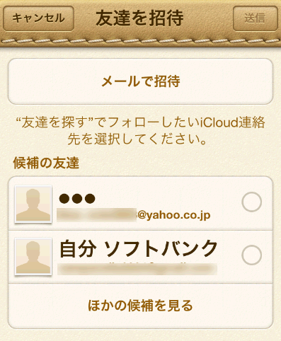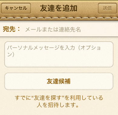 もし、相手が友だちを探すを使っていなかったり、候補には表示されない相手の場合は、メールで相手を招待します。