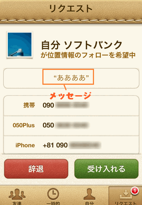 一番右の「リクエスト」は、知り合いや友達から登録のお願いが送られてくると、こちらが許可するまでここに表示されます。